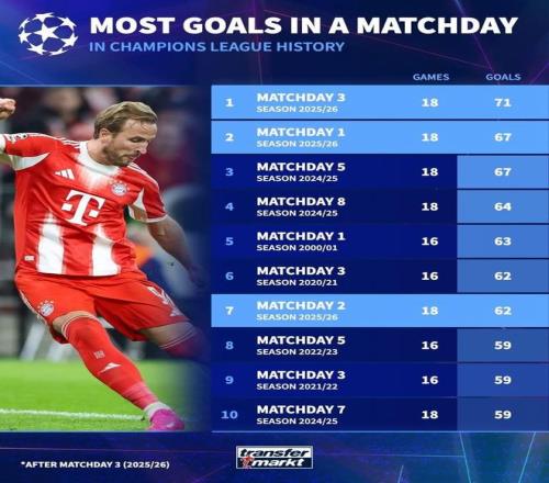 欧冠历史单轮进球数前10:本赛季第3轮71球第1,第1轮67球第2
